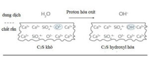 Quy luật nhiệt động học, phản ứng hóa học chỉ tự xảy ra nếu liên quan đến giải phóng năng lượng (thường là nhiệt độ). Do đó chúng không thể xảy ra ngược chiều mà không cần năng lượng bên ngoài. Điều này cũng là trường hợp của phản ứng xi măng với nước. Nước từ các nguyên liệu ẩm và từ nước phun làm mát thường có trong máy nghiền xi măng công nghiệp, thậm chí không có sử dụng phụ gia trợ nghiền. Vì vậy, có thể được giả thiết rằng phần lớn bề mặt của clanhke bị hydroxyl hóa chủ yếu hoặc thậm chí hoàn toàn. Điều này cũng rất quan trọng vì nước có tác dụng trợ nghiền, nói cách khác nước là một chất trợ nghiền yếu. Các phản ứng hóa học của các ion oxi (O2- ) với nước (H2O) để tạo thành các ion hydroxit (OH–) diễn ra không thuận nghịch (Hình 3).